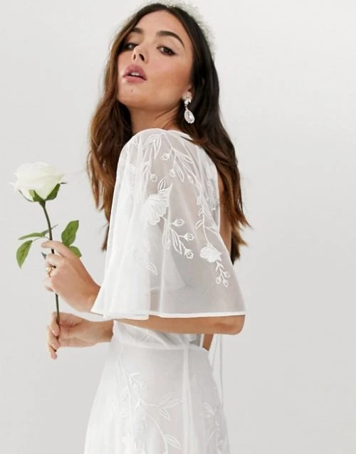 The beautiful white embroidered flutter sleeve wedding dress from Asos Edition is a guaranteed head-turner, you’ll find this piece as feminine as it is timeless. It features a high sheer neckline, a stunning silhouette and gorgeous floor sweeping skirt. Perfect for a bride this season.