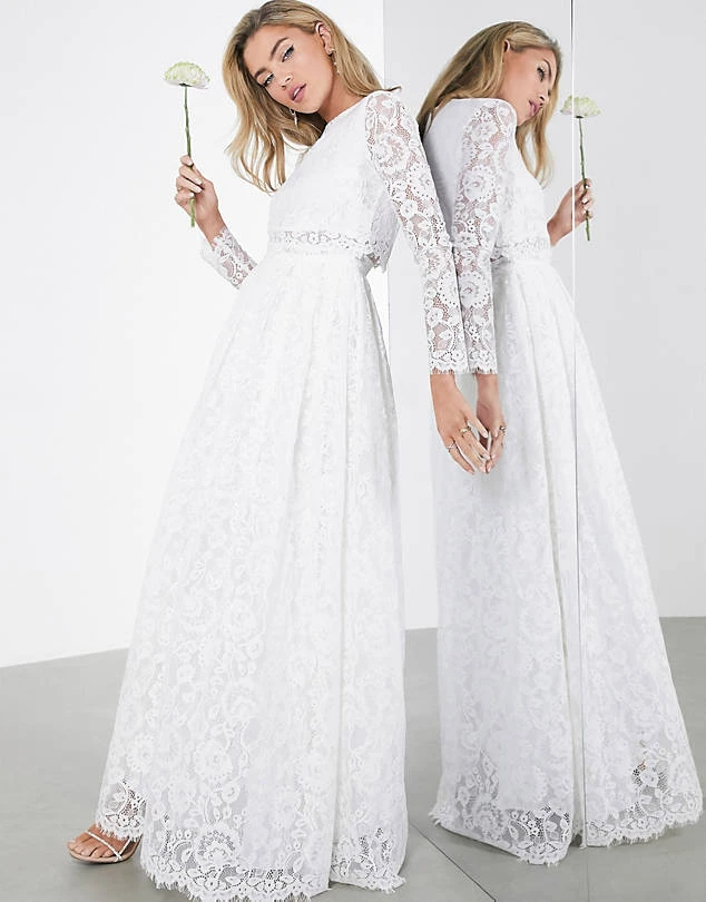 The beautiful white Lace Long Sleeve Crop Top Maxi Wedding Dress from Asos Edition is a guaranteed head-turner, you’ll find this piece as feminine as it is timeless. It features a round neckline, a stunning lace overlay, lace semi sheer sleeves for arm coverage and gorgeous floor sweeping skirt. Perfect for a bride this season.