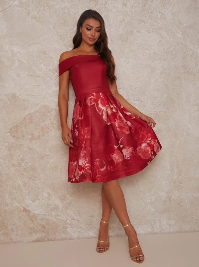 Be ready to turn heads in this beautiful red dress. Detailed with a pleated skirt, Bardot neckline and intricate floral print. Pair with your nude heels and statement earrings for the full look!