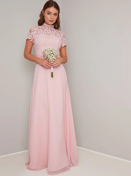 The gorgeous pink Krissy Lace Maxi Bridesmaid Dress from Chi Chi is a true show-stopper. Featuring a high neckline, a lace bodice and capped sleeves for arm coverage. This is the perfect dress for a modern bridesmaid or wedding guest.