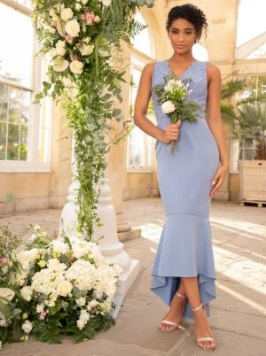 Your bride tribe will look stunning in this blush hue – the fitted silhouette with embroiled design fitted skirt is a bridesmaids dream!