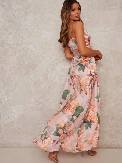 Update your prints with this floral dipped hem dress in a mink hue. Perfect for those special occasions.
