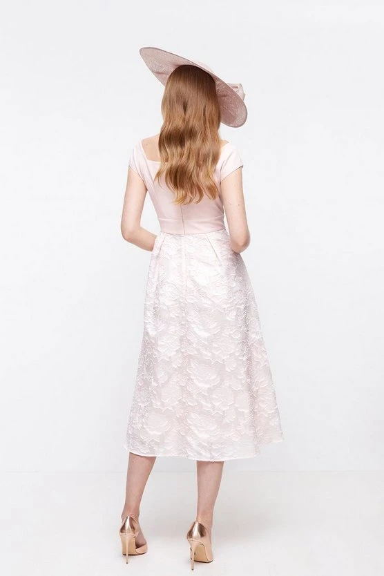 Stunning blush Bardot Clipped Jacquard Midi Dress featuring an off the shoulder neckline, cinched waist and A-line skirt.