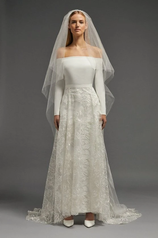 Create a bespoke bridal look with this wedding dress. As part of our bridal separates collection, the piece can be worn individually or together with the rest of the collection. Perfect to be used as a base layer, the dress is designed with a fitted shape, bardot neckline and column hem.