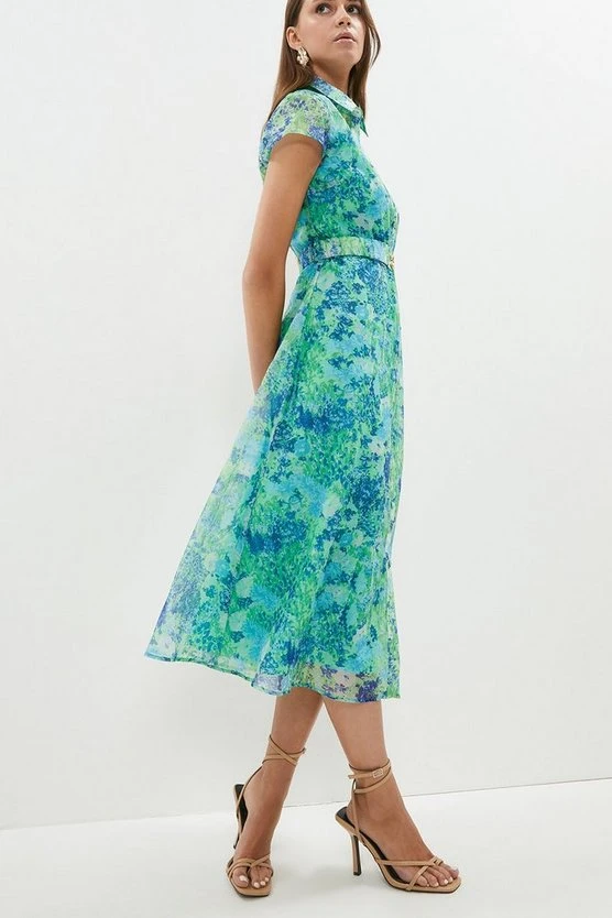 Perfect summertime adventures with this dress. The ultimate midi length, the Belted Organza Shirt Dress offers a romantic touch, alongside short sleeves and gentle pleats.