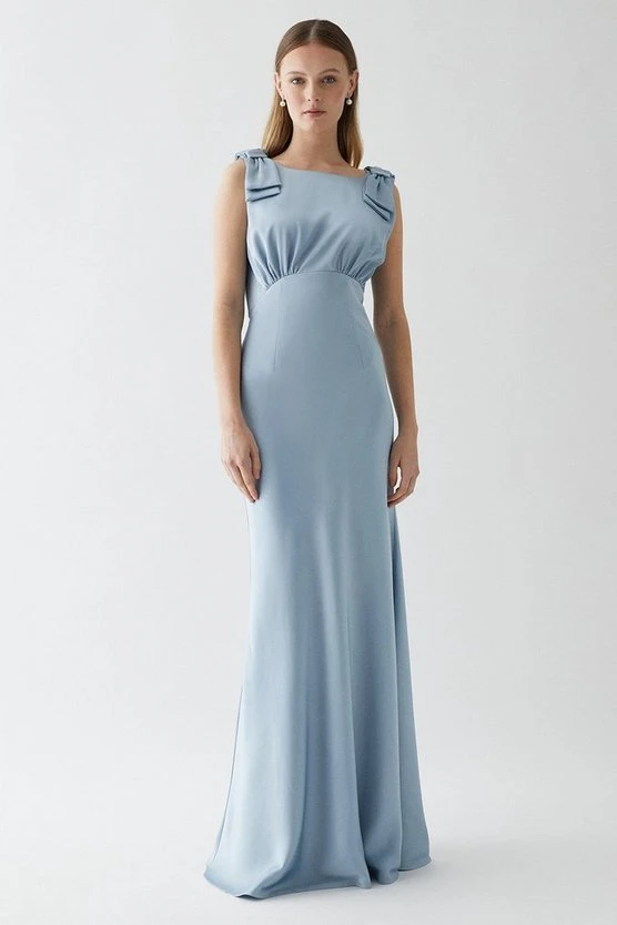 Stunning pale blue Bow Shoulder Cowl Back Bridesmaid Maxi Dress, perfect for a special wedding.