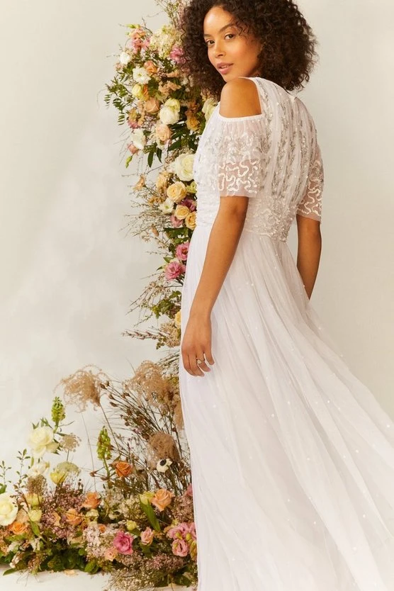 A beautiful Cold Shoulder Embellished Bridal Dress, featuring a V neckline, floor sweeping silhouette and stunning embellishment. Perfect for a modern bride.