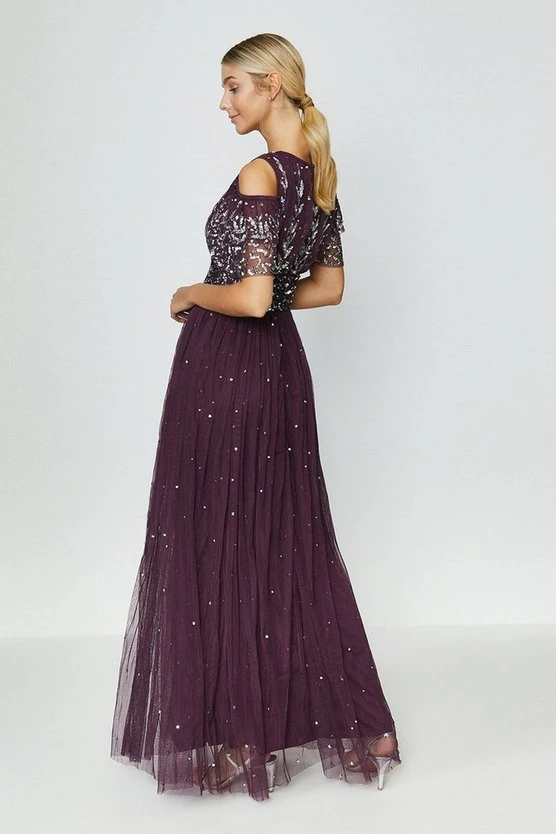 Hello, sequins! Make your entrance in our ultra-SPARKLY maxi dress. We’ve made it with a beautiful sequinned bodice, alongside cold shoulder detail, layered sleeves and pleated tulle skirt.