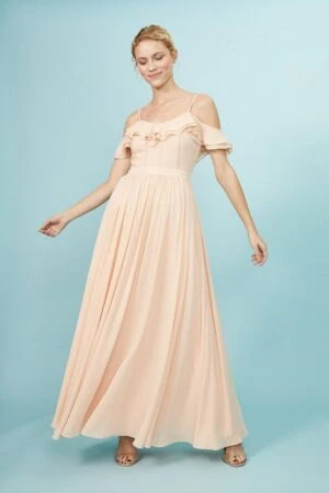 This dress is an instant mood booster. Designed to put you in a good mood (wherever you are), the piece features a cold shoulder neckline, ultra-pretty ruffles trims, a ribbon banded belt and flowing maxi skirt.