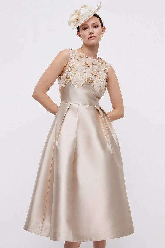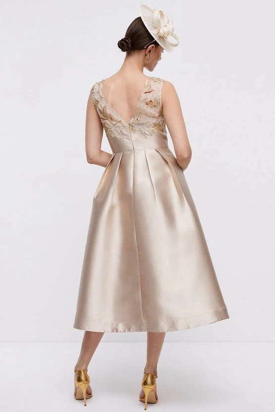 Beautiful champagne Cutwork Lace Trim Full Skirt Midi Dress, perfect for a VIP guest.