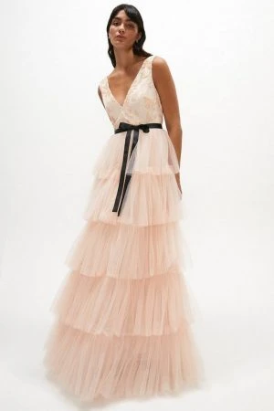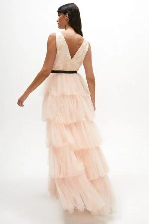 A beautifully designed blush pink maxi dress crafted from layered tulle featuring a V neckline and floor sweeping skirt.
