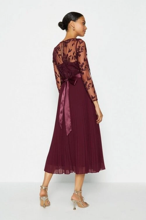 The perfect bridesmaid dress…Coast’s stunning Aubergine embroidered midi dress features a mesh floral bodice and sleeves (so lovely!), alongside a ribbon-tie waist, pleated skirt and comes in a midi length.
