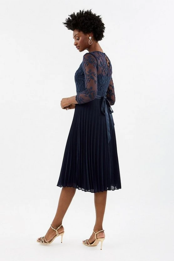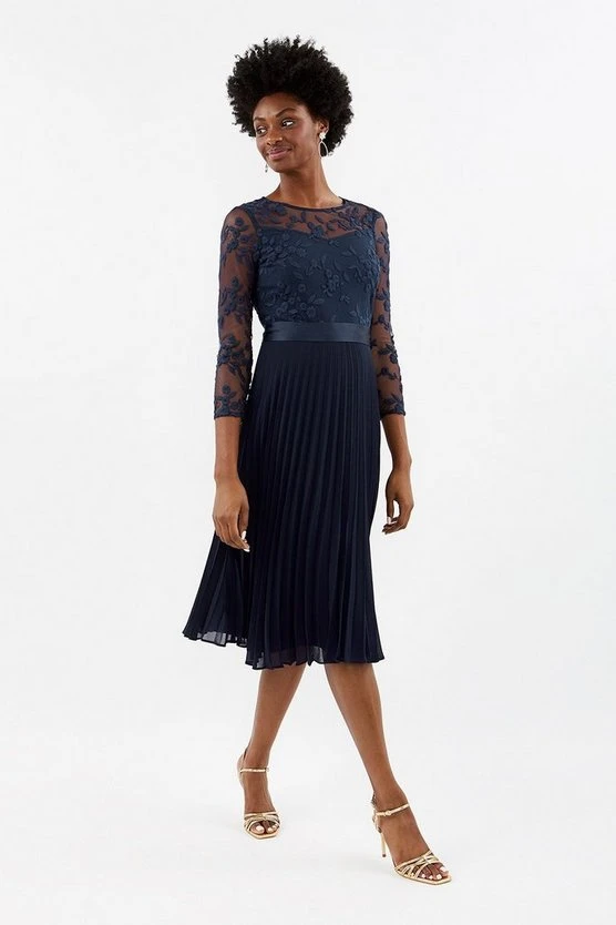 The perfect bridesmaid dress…Coast’s navy embroidered dress features a mesh floral bodice and sleeves (so lovely!), alongside a ribbon-tie waist, pleated skirt and comes in a midi length.