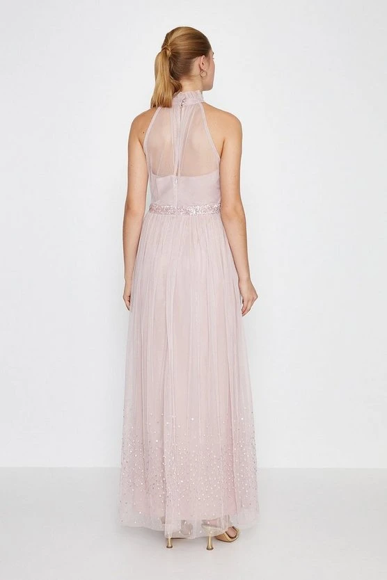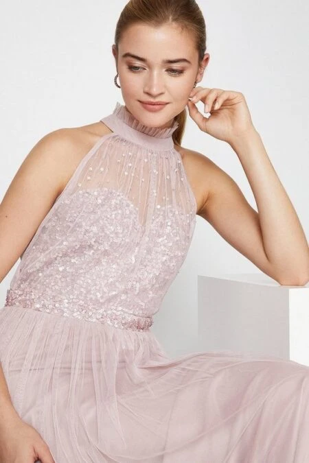 Dorothy Perkins Square Neck Embellished Pleated Maxi ​Bridesmaid Dress, Light Blue