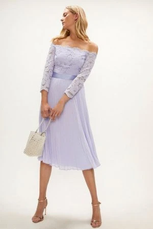 Designed to be worn for years (and years) to come, this dress is the definition of timeless beauty. The gown comes complete with a scallop-trim Bardot bodice, ribbon sash bow at the waist and ultra-gorgeous pleated skirt.
