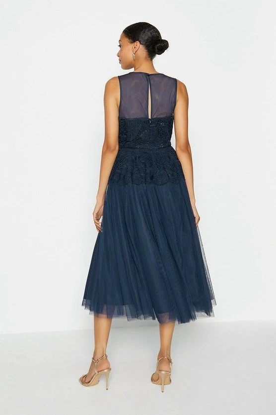 Throw this stunning Lace Bodice Tulle Skirt Dress and turn heads! Featuring a sheer neckline, cinched in waist and lace detailing, this midi dress is perfect for a modern bridesmaid.