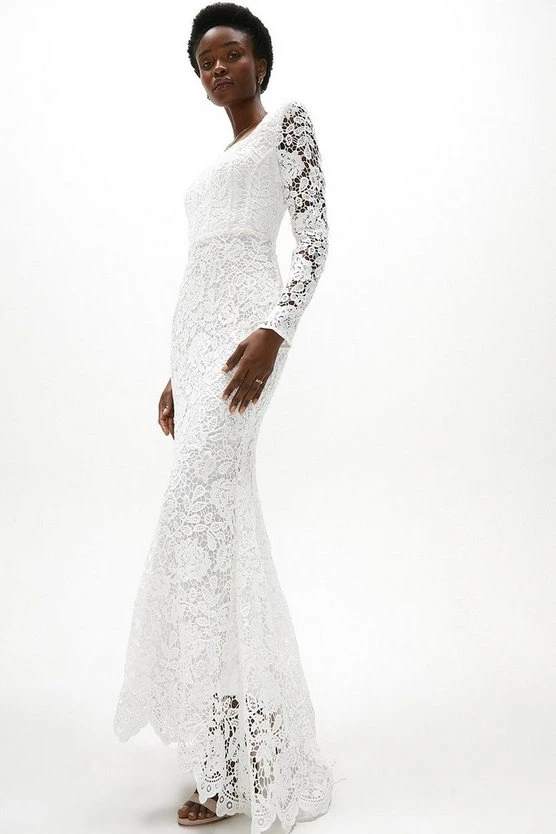 Turn heads in the stunning white Lace Long Sleeve Bridal Dress With Trail, perfect for the modern bride.