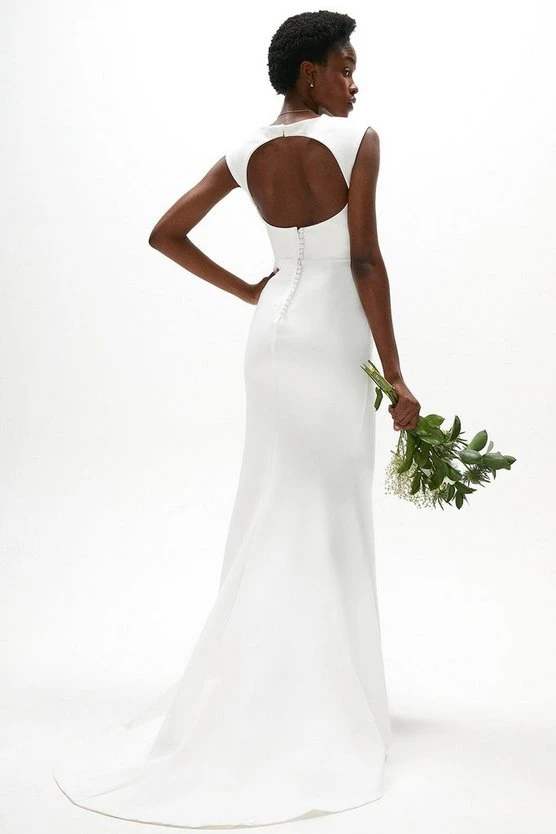 A beautifully designed elegant ivory wedding dress featuring a square neckline and fitted silhouette. Perfect for a modern bride.