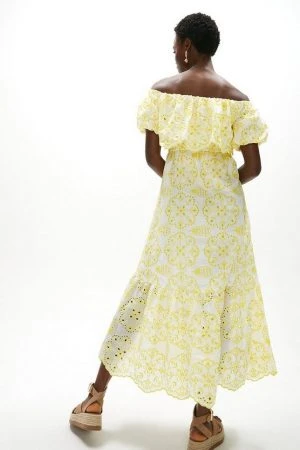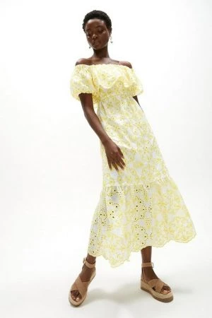 The stunning yellow and white Midi Cotton Ruffle Broderie Maxi Dress is perfect for those hot days in the summer sun!