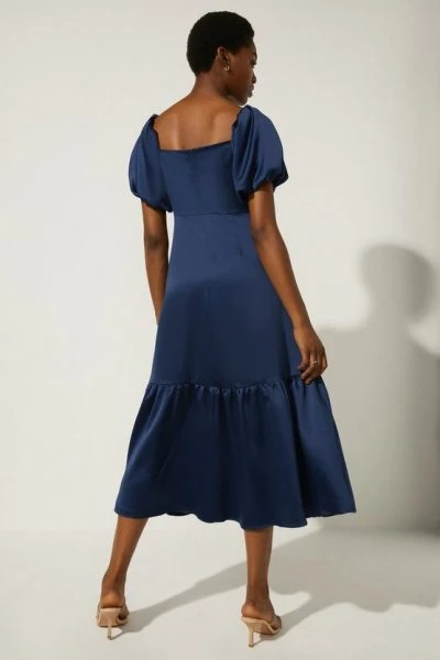 The beautiful navy Oasis Bardot Ruched Front Midi Dress is a perfect choice for a modern bridesmaid. This dress features an optional bardot neckline, relaxed puff sleeves and a soft A-line skirt.