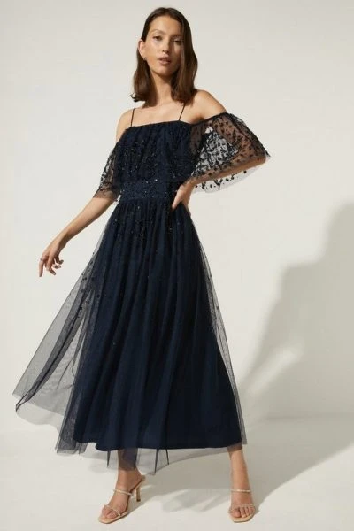 The beautiful navy Embellished Mesh Bardot Midi Dress is a perfect choice for a modern bridesmaid. This dress features a boho inspired bardot neckline, embellished body and a relaxed midi skirt.