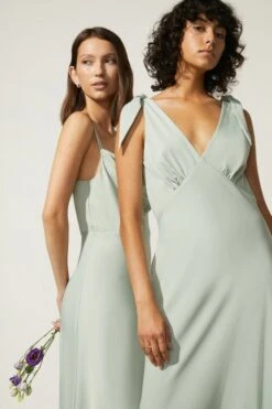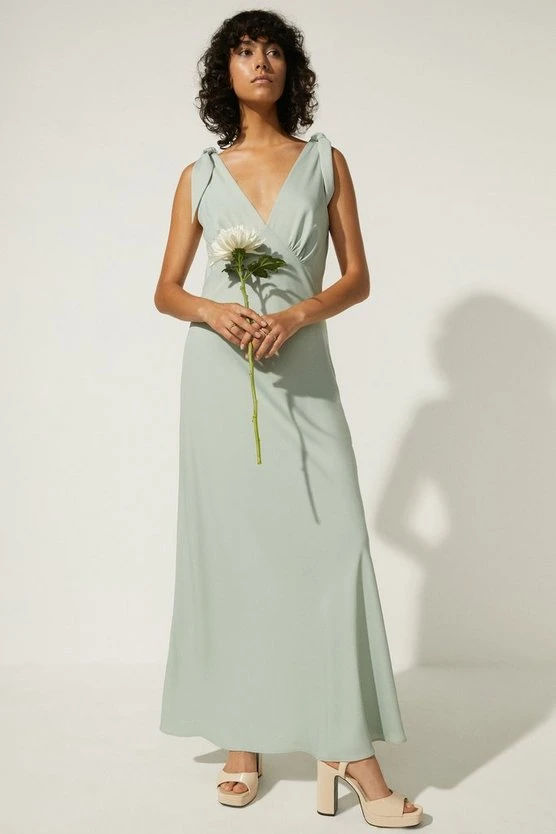 The beautiful sage Tie Strap Bias Cut Maxi Dress is a perfect choice for a modern bridesmaid. This dress features an elegant V neckline, cinched waist and soft floor sweeping skirt.