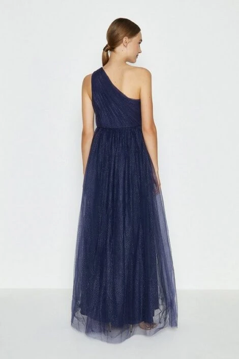 Take a bow in our dress. We’ve made this gown with an eye-catching glitter overlay, a one shoulder neckline, and stunning cinched waist.