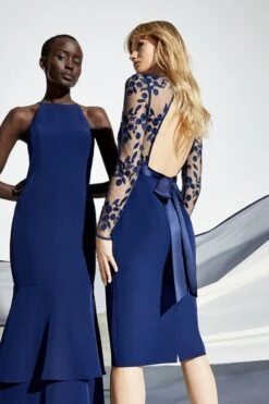 The beautiful navy blue Open Back Embroidered Midi Dress is a perfect choice for a modern bridesmaid. This dress features an elegant V neckline, cinched waist and open lace back.