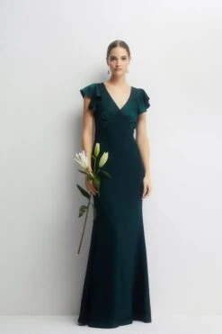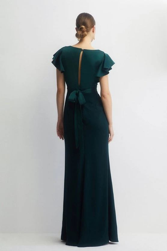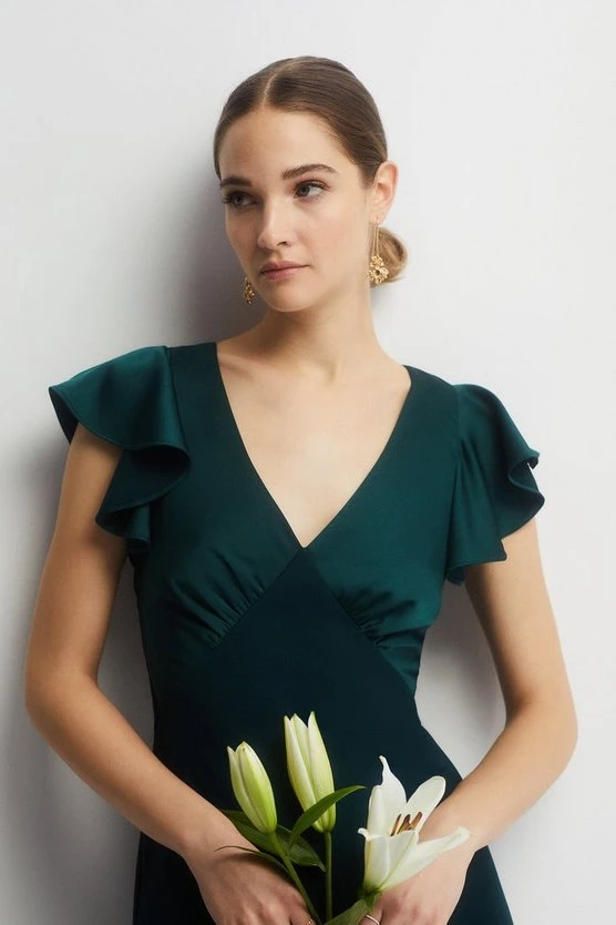 The beautiful green Open Ruffle Back V Neck Satin Bridesmaids Dress from Coast is perfect for a modern bridesmaid.