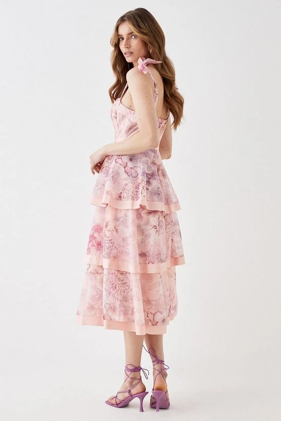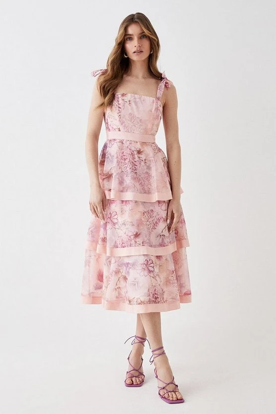 Stunning pink organza tiered midi dress, perfect for any wedding guest this season.