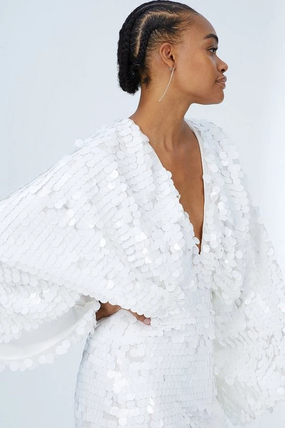 Stunning Pearlescent Statement Sequin Kimono Mini Dress, perfect for a modern bride.