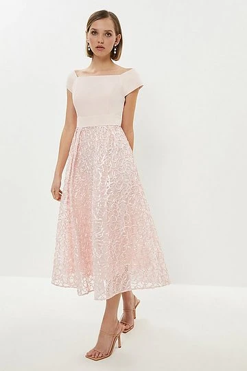 You won’t find a dress lovelier… Featuring a beautifully embroidered skirt, this pretty midi comes complete with a Bardot bodice that’s as stylish as it is flattering.