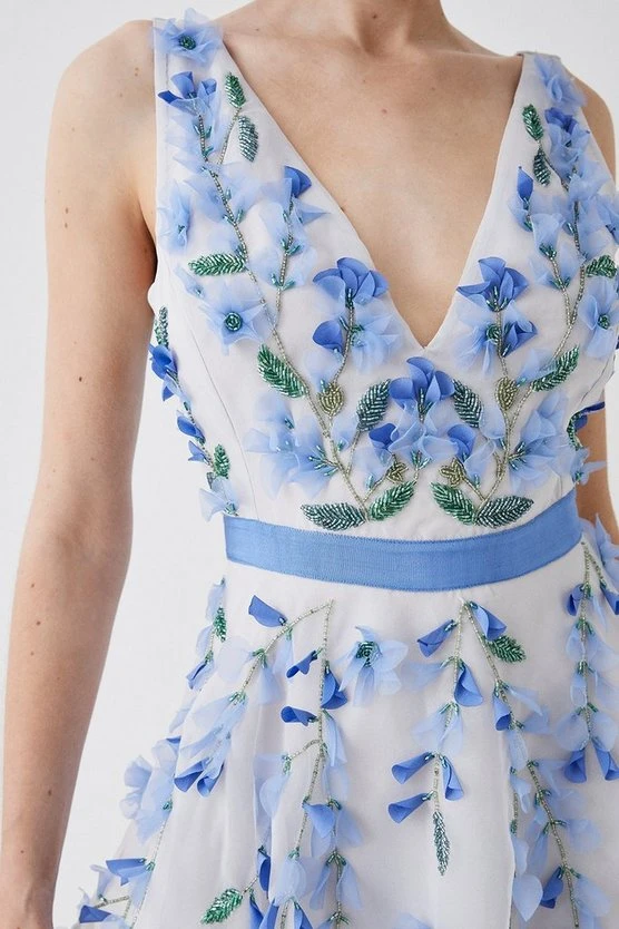 Beautiful white and pale blue Plunge Organza 3d Floral Full Skirt Midi Dress, perfect for a VIP guest.