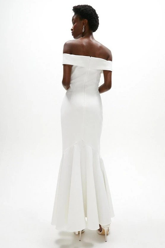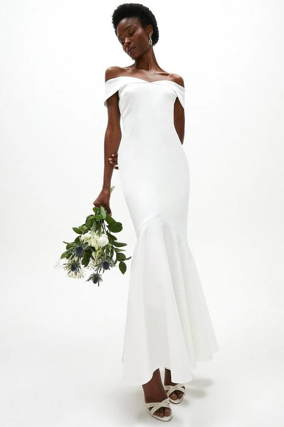 A beautifully designed ivory wedding dress crafted featuring a Bardot neckline, fitted shape and mermaid silhouette.