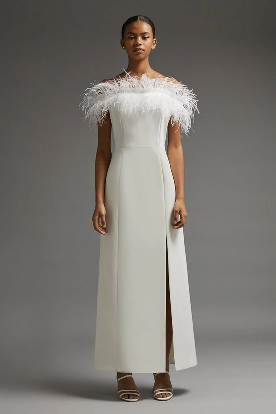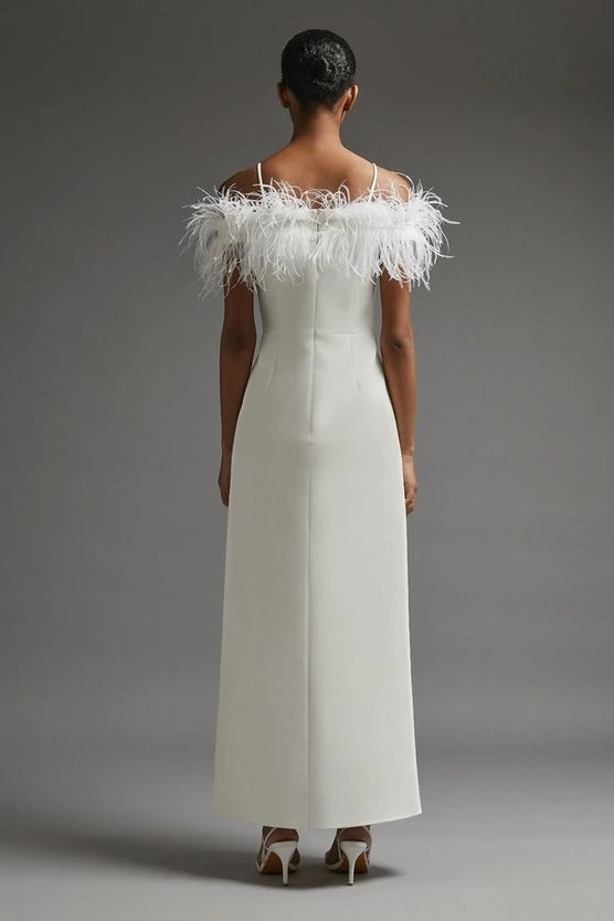 Did someone say show-stopper? Detailed with a spray of flamboyant feathers, this premium maxi dress is sure to steal the spotlight at special events. It comes cut to a dramatic length complete with a hem split and slender straps.