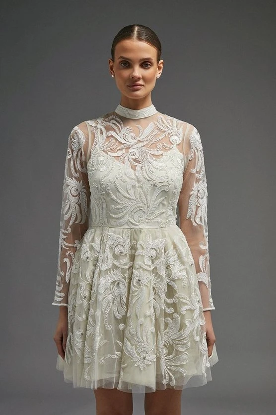 Introducing your ultimate wedding party dress. Designed to look just as beautiful as the scenery, the piece showcases a stunning flattering silhouette, it comes crafted with delicate body, a bustier bodice, a nipped-in waist and a short skirt that’ll move elegantly from day to night.