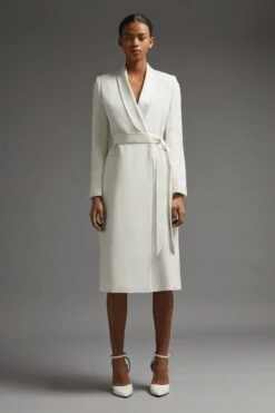 Who needs a big wedding dress? Look to this bridal dress for something different on your special day! Ultra-elegant and ultra-fitted, the piece beautifully wraps around your figure with its classic tux design. Tying at the waist using a pretty bow detail, you’ll be the most stylish bride ever.