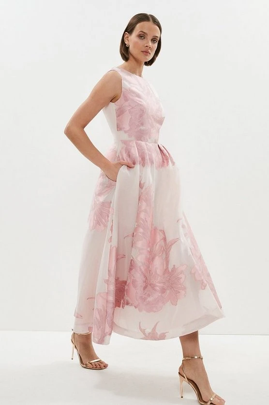 What’s better than a picture-perfect party dress? One with pockets, of course! This show-stopping number shows off a bold placement print and refined jacquard finish, classic boat neckline and a swishy midi skirt. Just add your favourite strappy heels and prepare to dazzle at after-dark events.