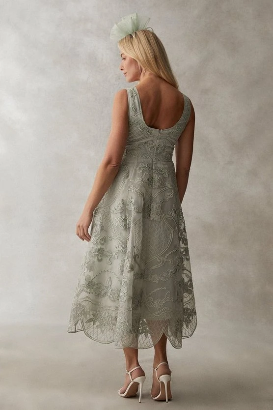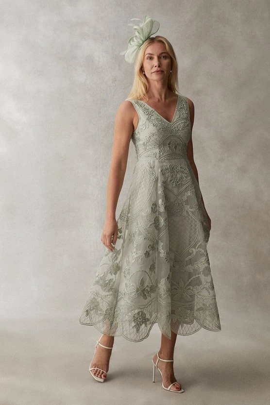 Stunning sage Premium Plunge Neck Cutwork Lace Midi Dress, perfect for a special wedding.