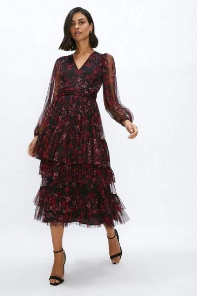 This stunning Printed Mesh Tiered Long Sleeve Midi Dress from Coast was made to turn heads. Designed with long sleeves and a subtle print, this show-stopping dress makes the perfect dress for this seasons events.