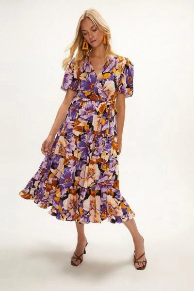 This stunning floral tiered midi dress is sure to go straight to the top of your wish list. Featuring a V neckline and wrap style tie, this dress is the perfect piece for a wedding.