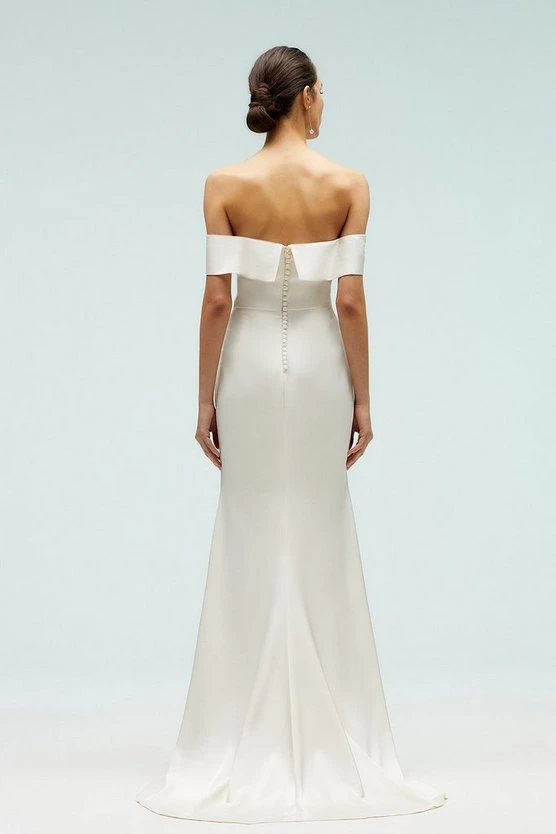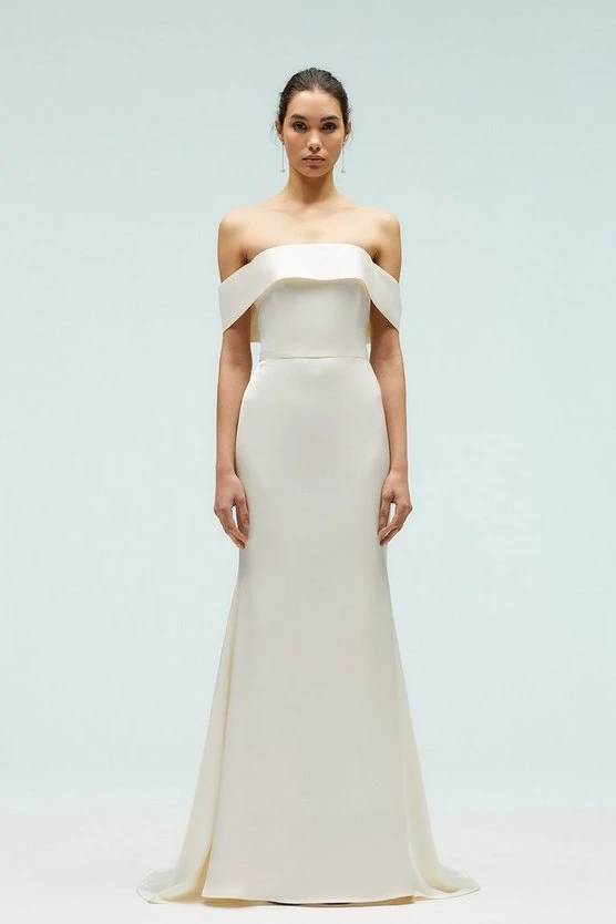 Stunning Satin Bardot Fishtail Maxi Dress With Train, perfect for a modern bride.