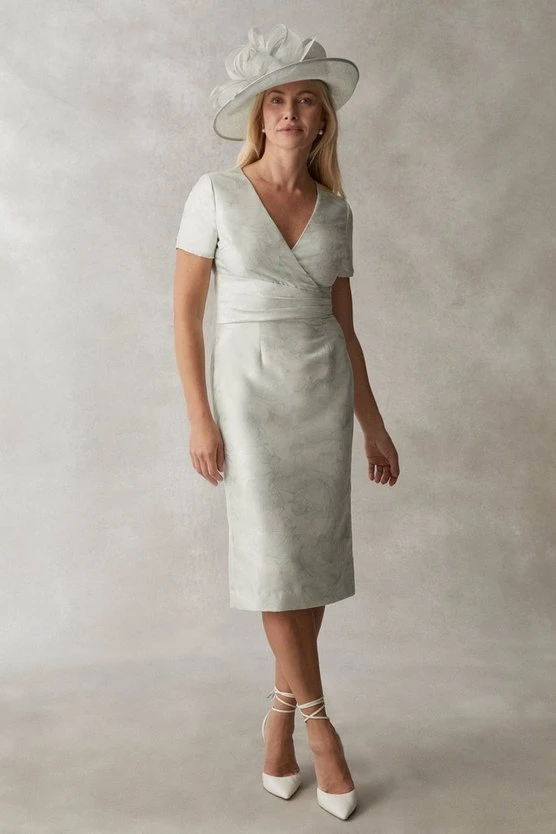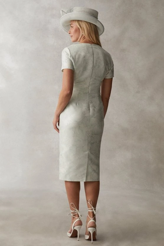 Stunning Satin Jacquard Pleat Detail V Neck Pencil Dress, perfect for a special wedding.