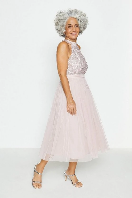 Unleash your inner princess with this maxi dress. Taking you to the ball (or wherever else you fancy) in style, it features a halterneck sequinned bodice, banded waist and midi tulle skirt.