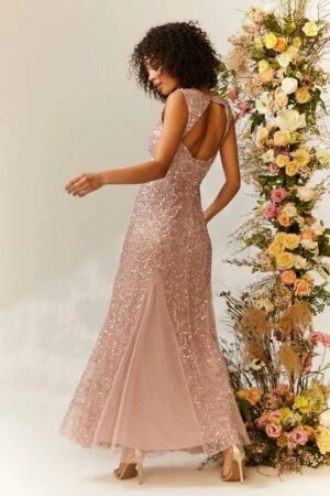 Make the day shine in this dress. Featuring hundreds upon hundreds of glistening sequins, our super-sparkly number is set to turn heads from aisle to party. Crafted with flowing tulle and a spilt skirt, the maxi-length gown is just the thing to dance into the night with.