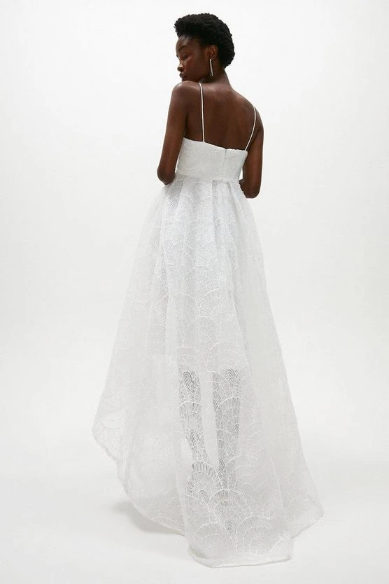 A beautifully designed white high low bridal dress adorned with stunning tulle. An easy to wear A-line silhouette, with a bandeau neckline and form fitting bodice creating a flattering fit. A modern bridal dress, perfect for the big day.