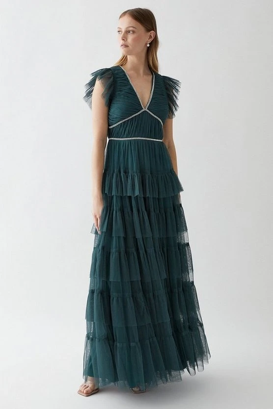 Stunning forrest green Tiered Tulle Diamante Trim Bridesmaids Dress, perfect for a special wedding.