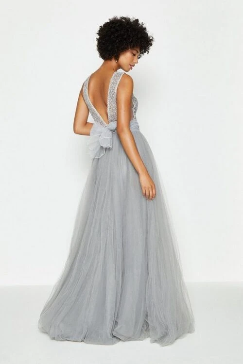 Make your own fairytale in this dress. The stunning gown features a sequinned bodice, sheer panelling and low V-back, alongside a full tulle skirt designed for twirling the night away.