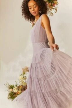 This dress is just tulle good. Designed with pleated and tiered layers of tulle, you’ll swish beautifully from room to room thanks to its flowing maxi skirt