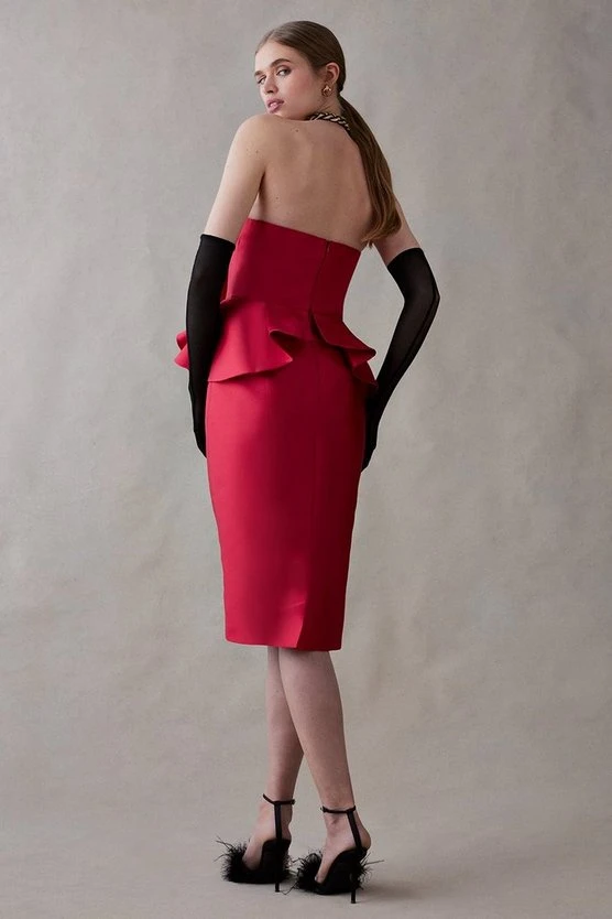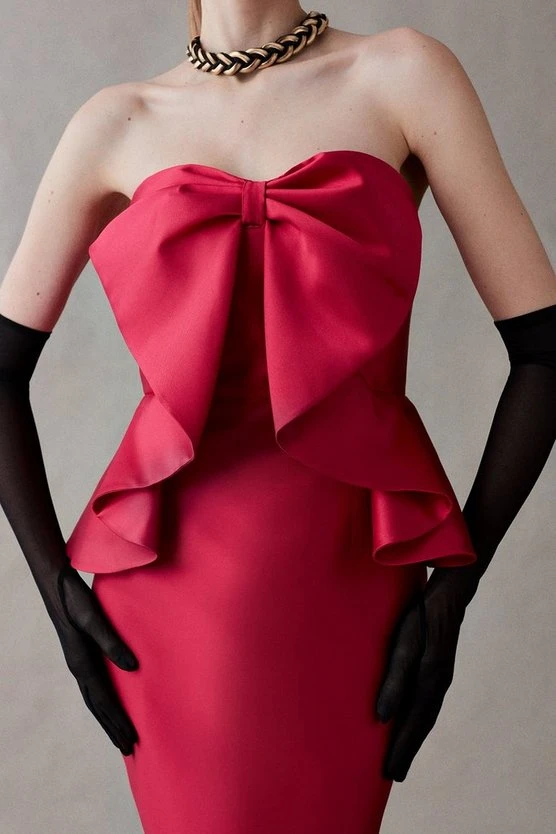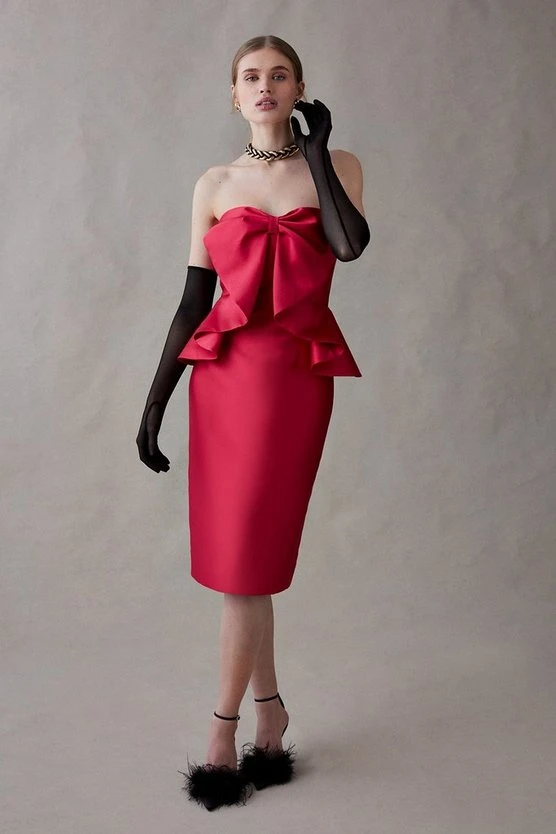 Beautiful red Twill Pencil Dress With Bow Front, perfect for a VIP guest.
